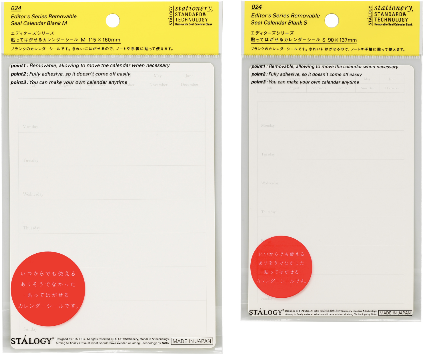 日付欄が書き込み式で、スケジュールの開始日を自由に設定できるカレンダーです。裏面全体に再はく離可能なのりがついているシールタイプなので、ぴったりと貼れてひらひらすることがなく、後できれいにはがすことができます。ノートやファイルなどお気に入りの文房具にスケジュール機能をつけたり、STALOGY 365Days Notebookに貼れば、1年の予定管理にも役立ちます。