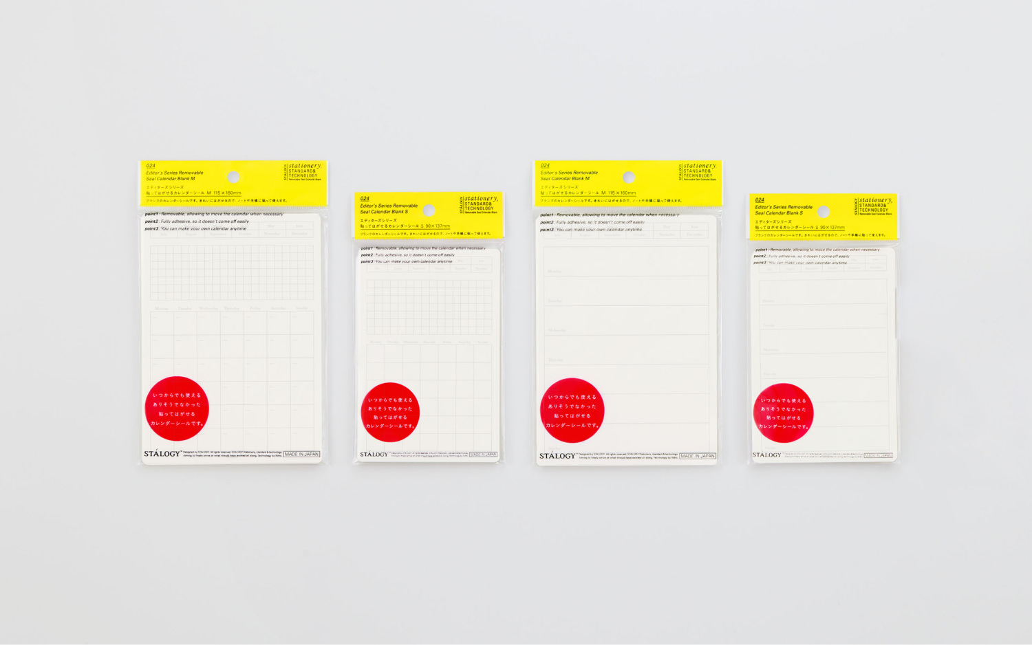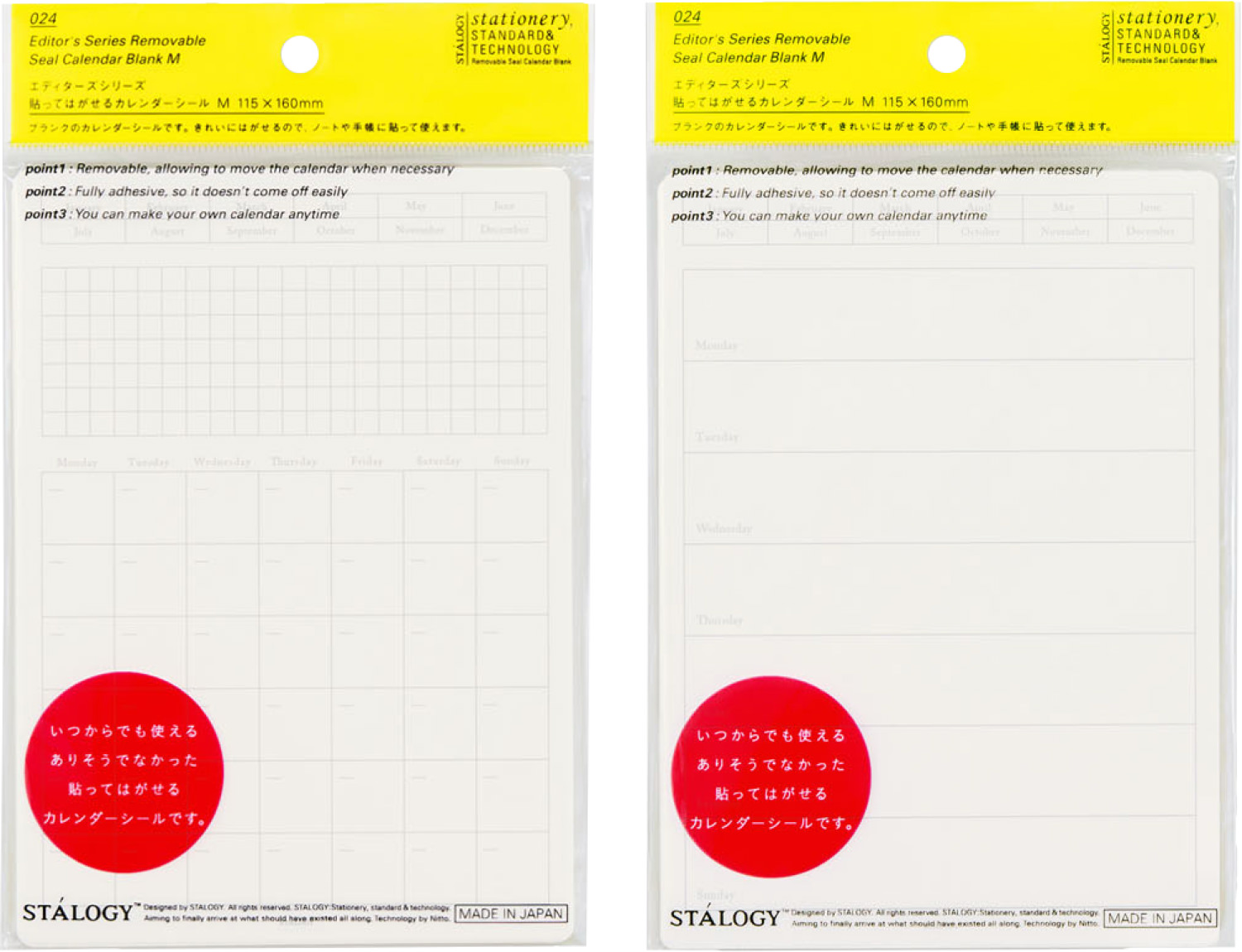 日付欄が書き込み式で、スケジュールの開始日を自由に設定できるカレンダーです。裏面全体に再はく離可能なのりがついているシールタイプなので、ぴったりと貼れてひらひらすることがなく、後できれいにはがすことができます。ノートやファイルなどお気に入りの文房具にスケジュール機能をつけたり、STALOGY 365Days Notebookに貼れば、1年の予定管理にも役立ちます。